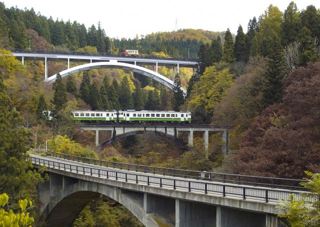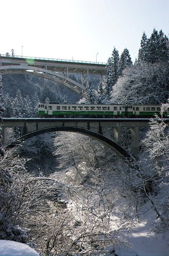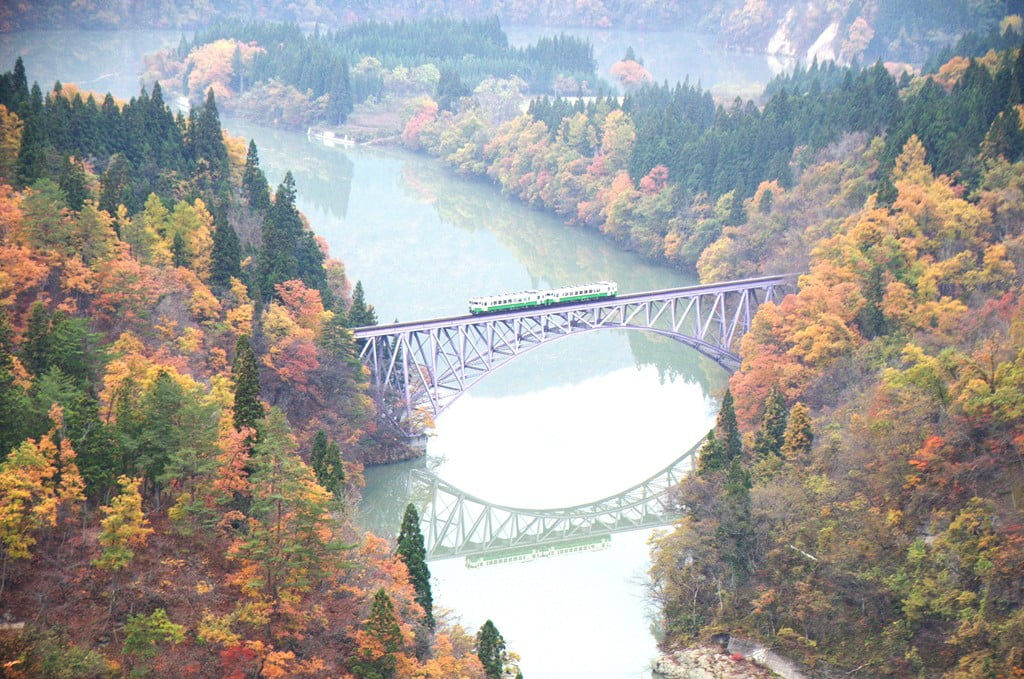 當你經過了會津柳津,很快就會來到可謂是整個只見線上最有名的景點:第一只見川橋梁。這是只見線上唯一的桁架拱橋,使用和三島町盛產的桐花一樣的淺紫色上色。從橋上往下望,橋身倒映在清澈的河水裡,又被水面層疊而朦朧的水霧包裹覆蓋,可謂是人間仙境。這座橋周圍的風景也完美地體現了只見線春夏秋冬四時景致的不同風情,因此只見線的宣傳照大多在這裡拍攝,我們找到了一些圖: