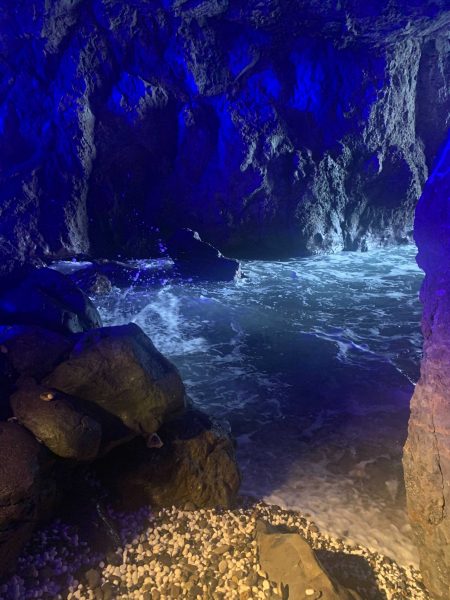 從空中展望台下來,在崖壁的另一側,可以拾級而下進入青色洞窟。這裡通過藍色的LED燈光,打造了一個充滿神秘的藍色洞穴,也可以在這裡觸摸到日本海的海水,還可以撿起小石子帶回家作為紀念。