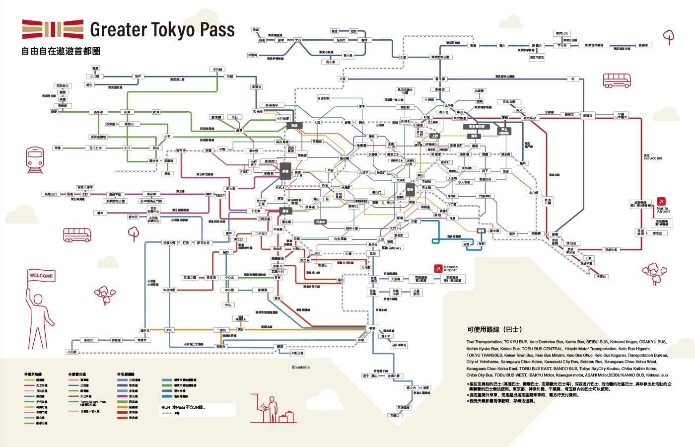 這張周遊券則非常適合還需要搭乘私鐵的遊客。東京除了23區遍佈地下鐵和JR鐵路以外,在23區外有很多私營鐵路連接了東京都心和非常多的人氣景點。通過這張Greater Tokyo Pass周遊券,不僅能夠在23區內無限次乘坐都營地下鐵和東京Metro的所有車次,還可以乘坐13家其他地鐵公司線路的車次及東京與周邊三縣的34家巴士公司的公車。