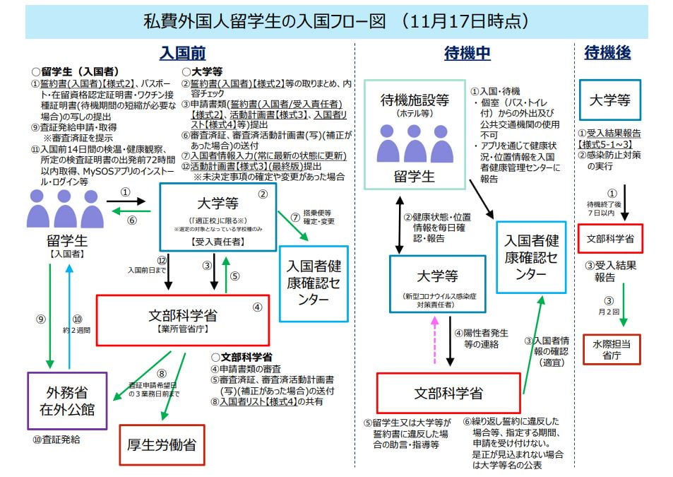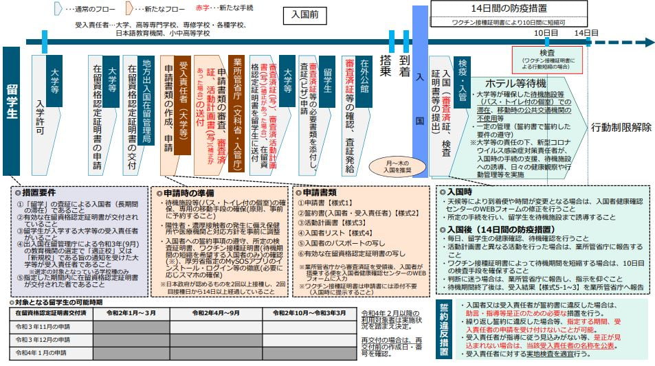 比如留學生本人需要向學校提交誓約書、有效期內的在留資格認定證明書、疫苗接種證明書掃描件、護照掃描件等文件,學校審核後,要將誓約書、活動計劃書、入國者名單提交文部科學省審核,並且需要獲得文科省審核後的查證認定。