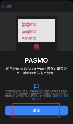 - 如果有加值,點按【Apple Pay】按鍵,然後在Apple Pay畫面按【繼續(続ける)】將卡片追加進Apple Pay。