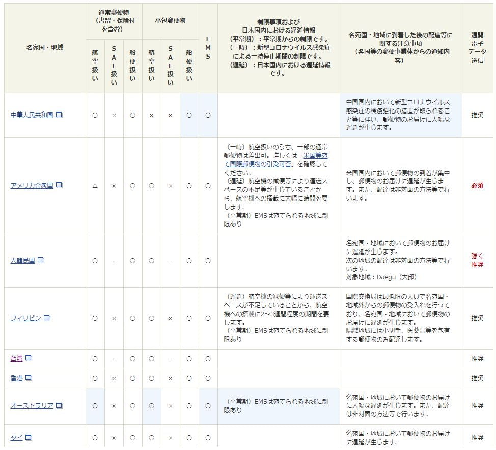 以下表格節選自日本郵局官方網站:国・地域別の差出可否