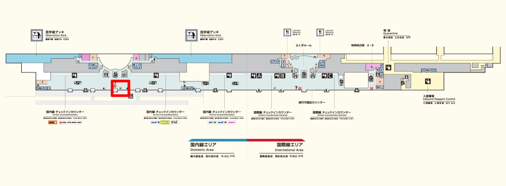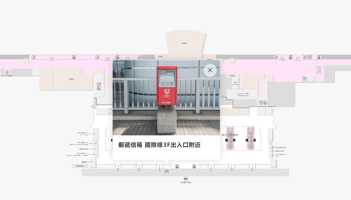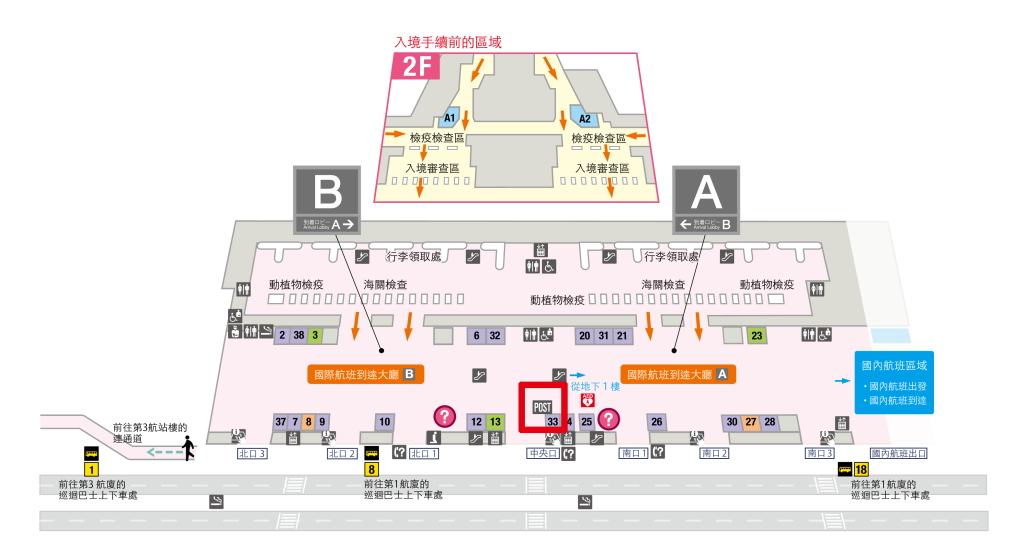 ※第3航廈並沒有受理郵政業務,即沒有郵局等,請使用第2航廈的設施,或使用下圖第3航廈2F出發大廳的郵筒。
