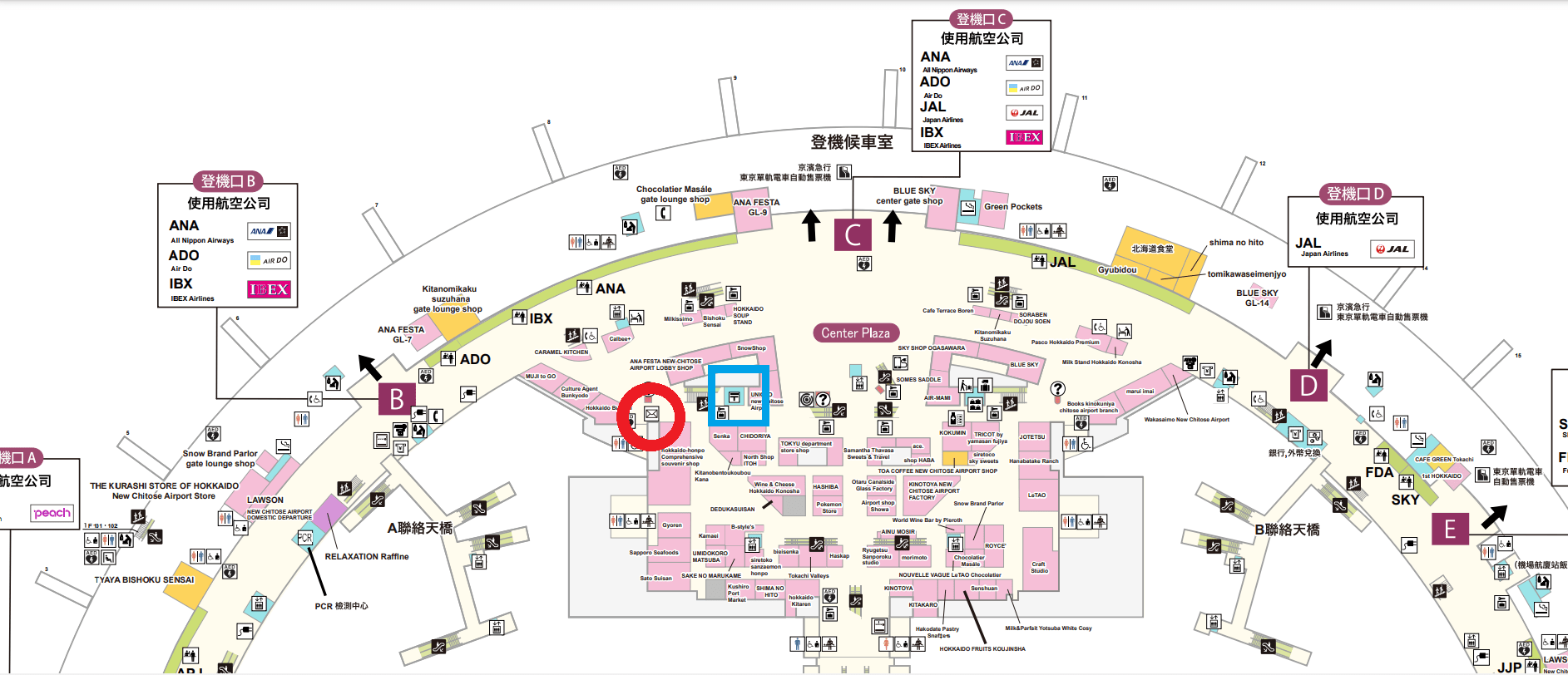 新千歲機場的二樓有千歲郵局新千歲機場內分局。下圖中藍框就是郵局的位置。紅圈則均為郵筒所在位置。