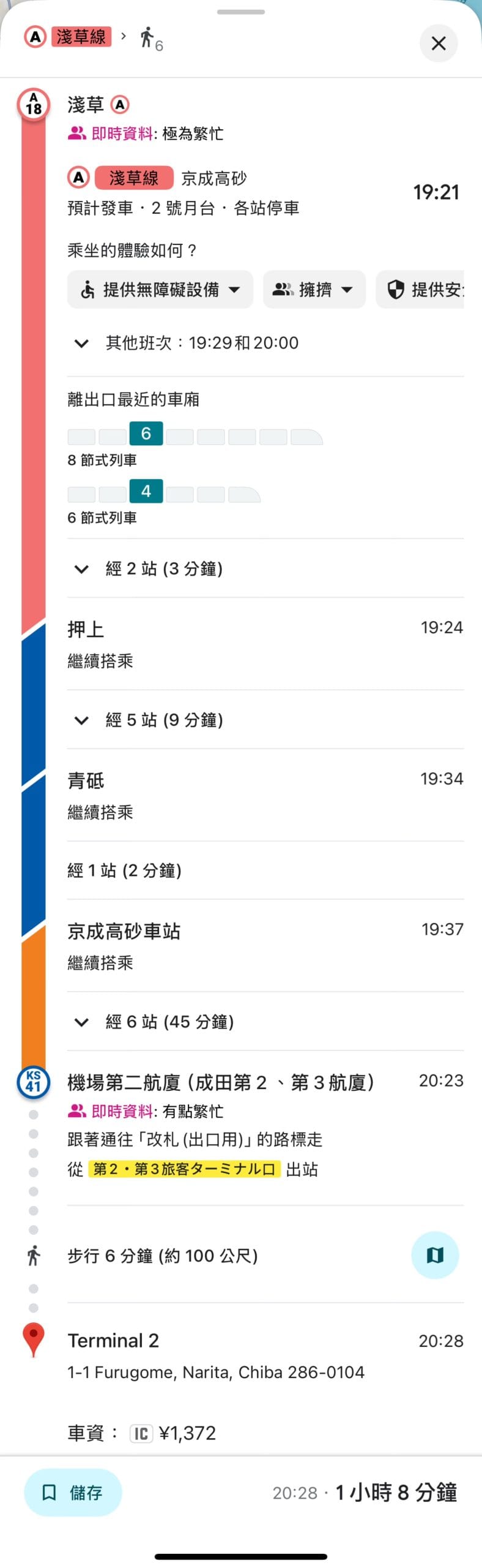 如果我們要從淺草車站前往成田機場,透過谷歌地圖的話有可能會查到以下的乘車方案: