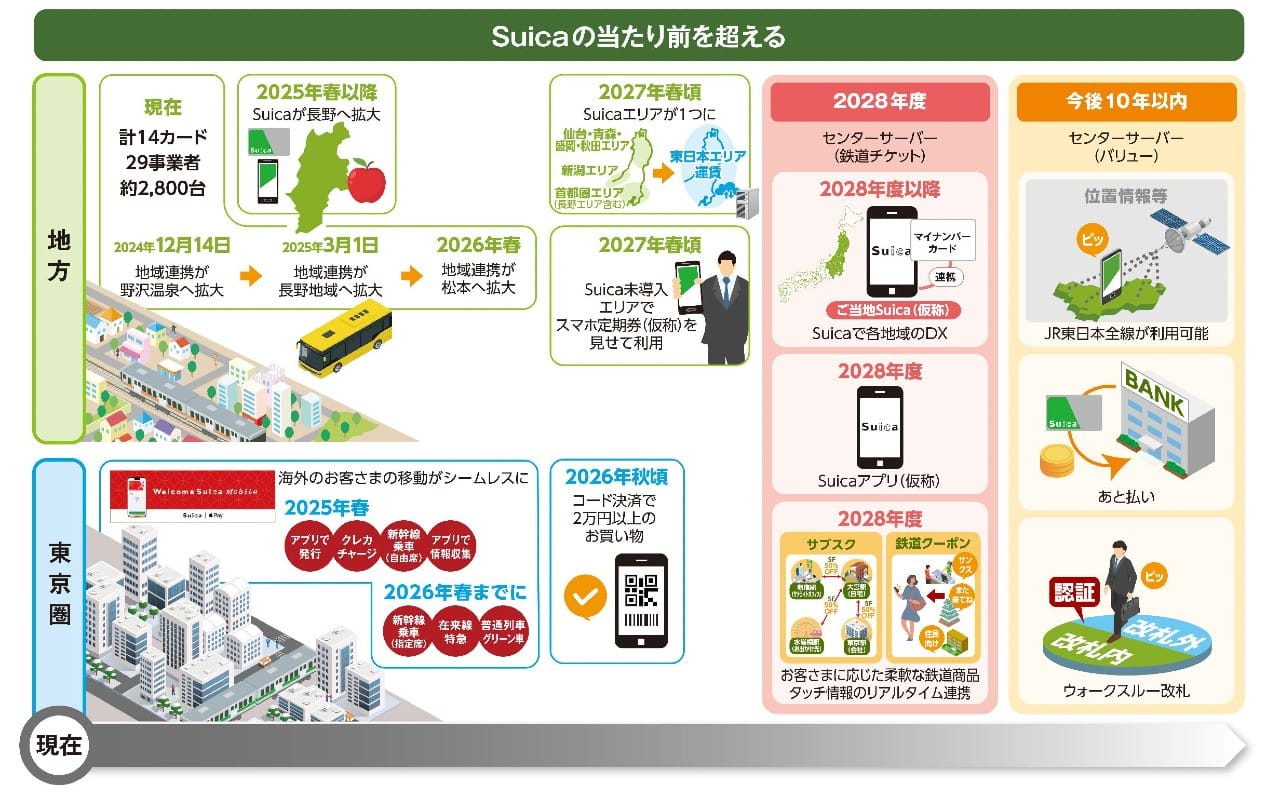2025年春天,JR東日本預計將長野縣收錄進首都圈區域的版圖中,今後嗶卡去滑雪將成為現實;2027年春天,則將會把上述不同的區域統歸「JR東日本區域」,一張Suica將可以走遍東日本地區。對於那些無法使用Suica的車站,JR東日本計劃開發「手機定期券(暫定名)」,在車站將手機定期券的畫面給Staff看即可直接進站乘車。